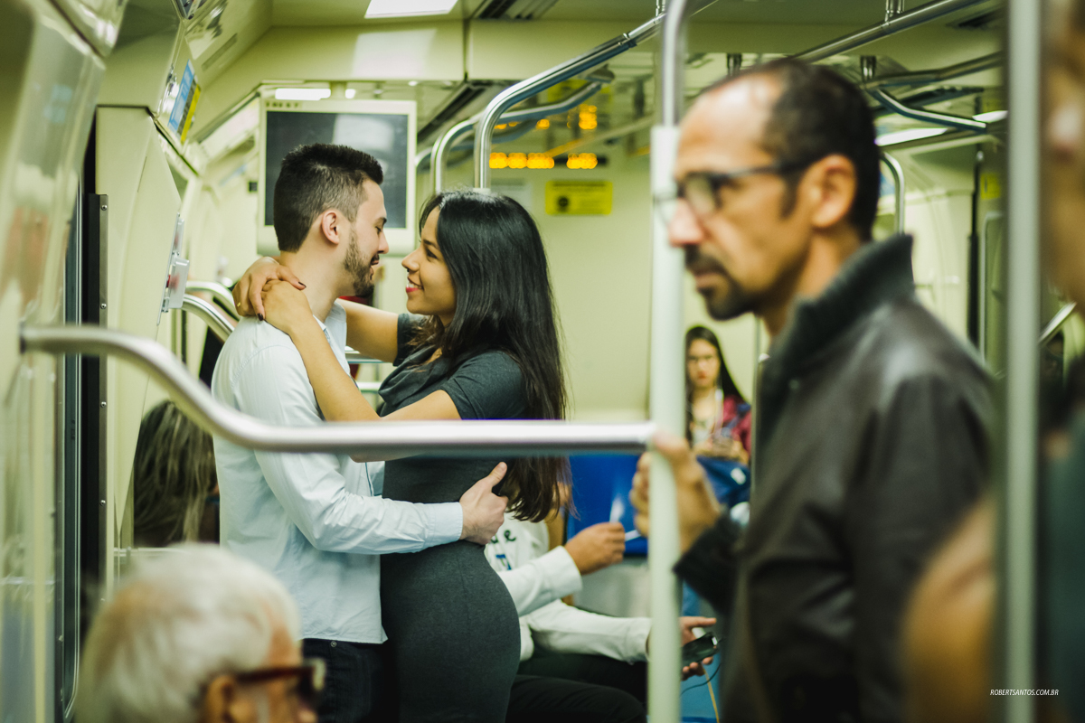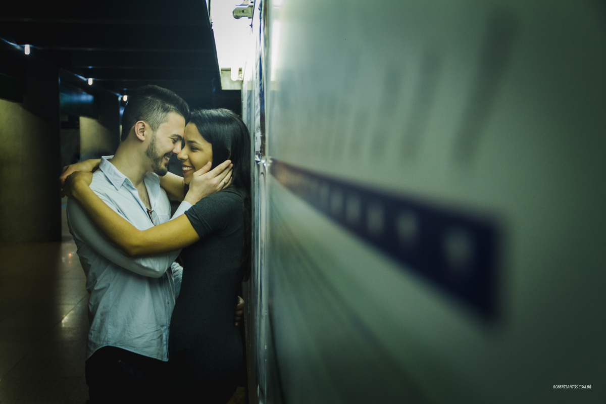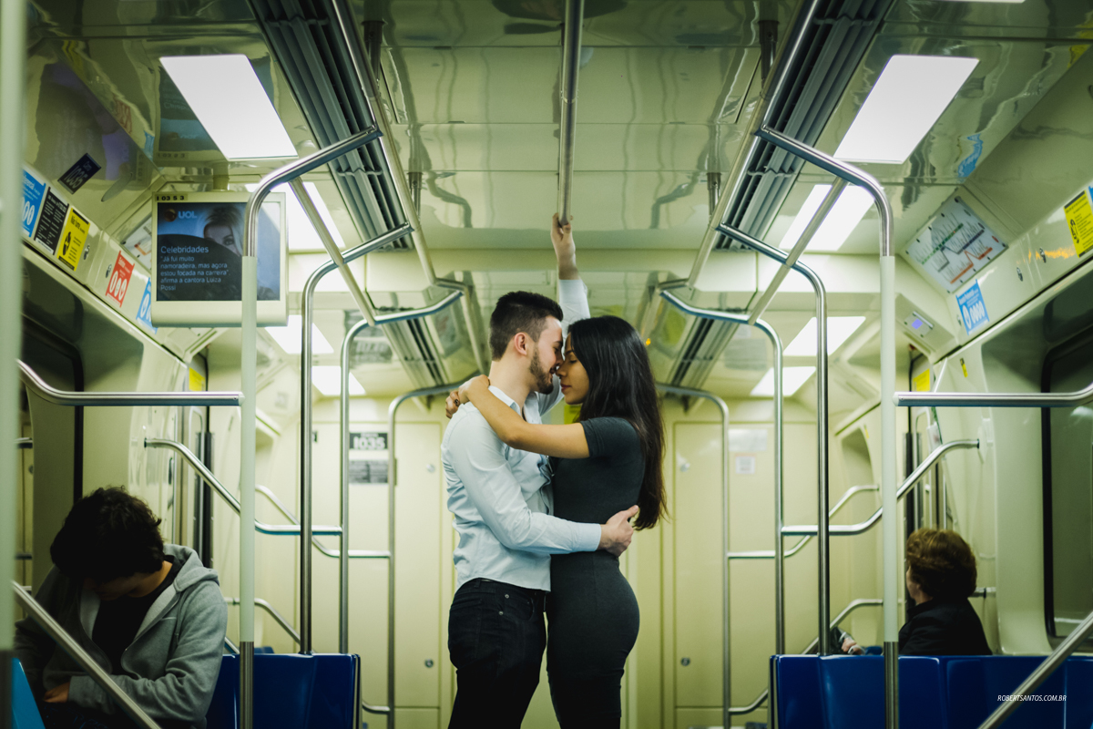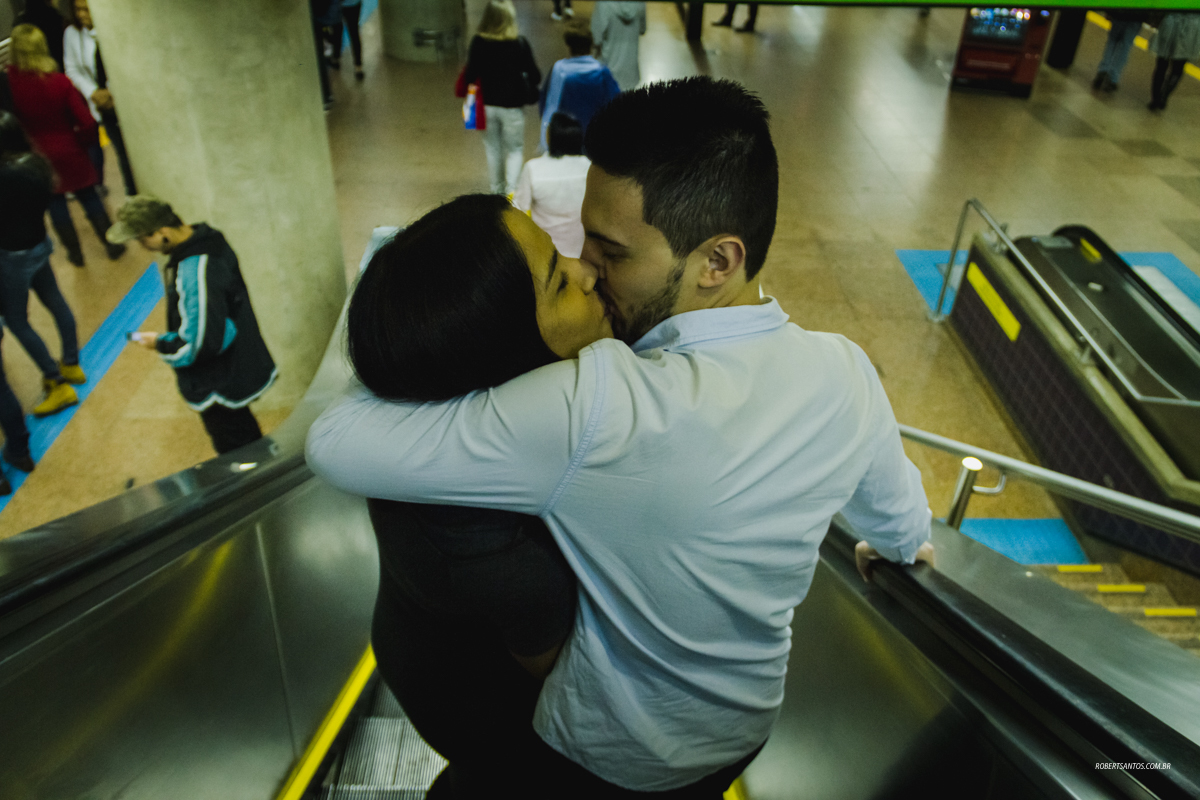 Iniciamos o ensaio na avenida passando pelo MASP e Parque Trianon, surgiu em minha mente a ideia de fazer parte do ensaio dentro do metrô, e os noivos curtiram a ideia logo de cara! Foi sensacional fotografar esse momento único podendo compor de uma forma diferente e divertida.
